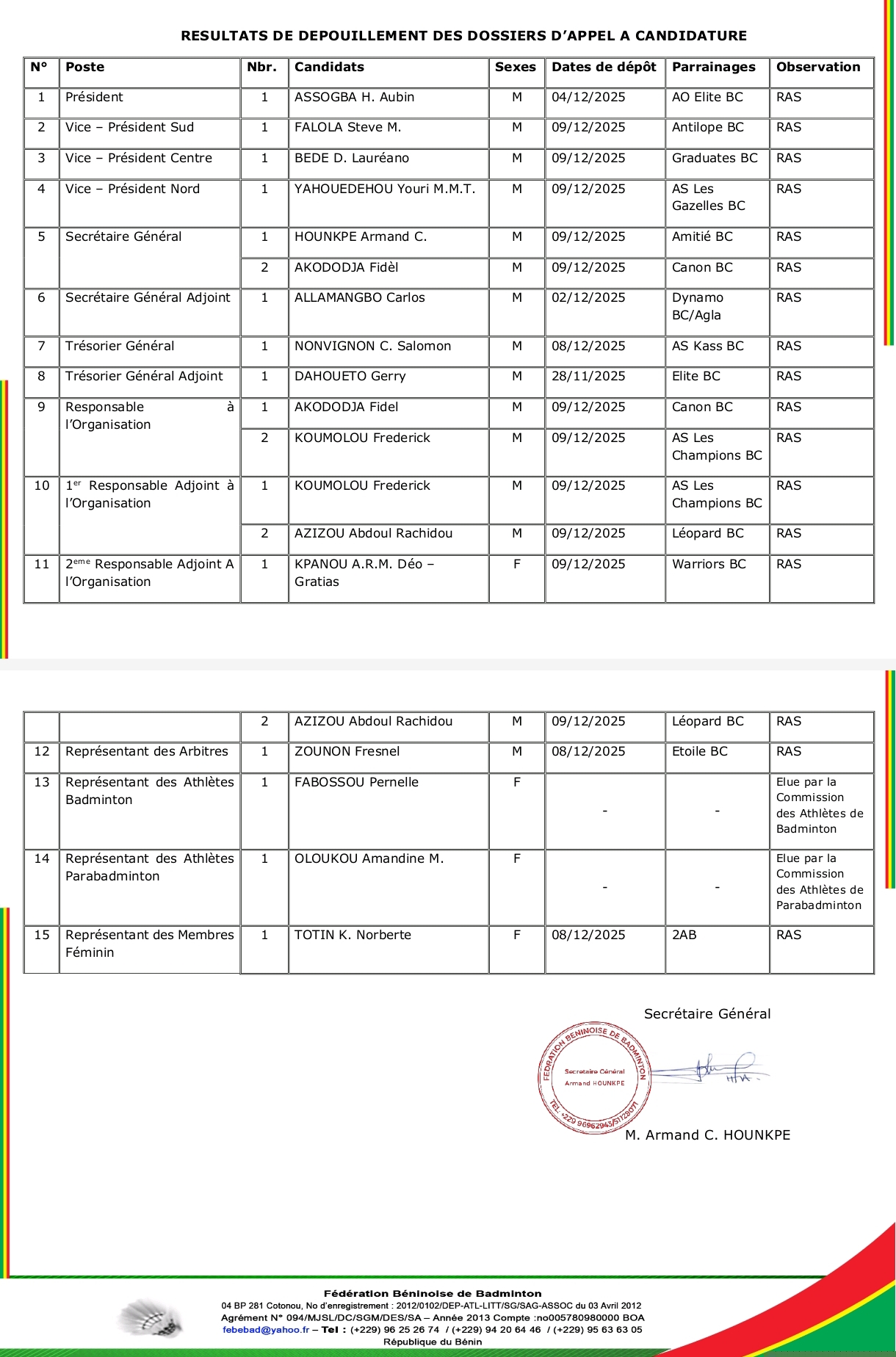 Les résultats de cette phase, consignés dans un tableau officiel, témoignent de l’intérêt manifesté par les acteurs du badminton béninois pour la vie de leur Fédération et pour le développement de la discipline. L’instance dirigeante de la FBBa a par ailleurs annoncé la tenue de son Assemblée générale élective pour le samedi 27 décembre 2025 à Cotonou. Cette rencontre déterminante permettra d’élire les nouveaux membres du Comité Exécutif chargés de conduire les destinées du badminton béninois pour les prochaines années.