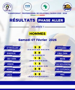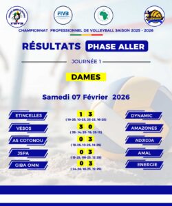 De son côté, Aso Nougnon s’est montré solide en déplacement en venant à bout de Vesos (3-1). Par ailleurs, Adjidja, Énergie, As Cotonou, All Stars et Finances n’ont laissé aucune chance à leurs adversaires, s’imposant tous sur des victoires nettes (3-0), avec autorité et maîtrise. À noter également la prestation convaincante d’Énergie face à Giba Omn, ainsi que la rigueur affichée par Finances VBC contre Allada Olympics, symboles d’équipes déjà bien en place dès l’entame du championnat.
