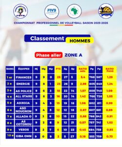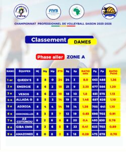 Avec une impressionnante récolte de 24 points, Queens Vbc survole le classement et confirme son statut de grande favorite de la zone. Derrière, la lutte est particulièrement intense entre Énergie Vbc et Vesos Vbc, toutes deux à 18 points. La différence entre les deux formations s’est faite au niveau des sets gagnés, où Énergie Vbc en compte 21 contre 18 pour Vesos Vbc. Le même scénario se répète plus bas au classement entre Allada Olympics et Adjidja Vbc, qui totalisent chacune 14 points. Là encore, c’est le nombre de sets gagnés qui départage les deux équipes, avec 19 pour Allada Olympics Vbc contre 18 pour Adjidja Vbc. Derrière, Hirondelles, AS Cotonou Vbc et Giba Omnisports complètent le tableau, tandis que Amazones ferment la marche avec 2 points.