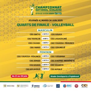 Chez les filles, les quarts de finale ont été marqués par des victoires nettes. Le CEG 1 Ouassa- Péhunco a confirmé son statut de favori en éliminant le CEG 1 Ségbana (2 sets à 0), tandis que le CEG Zongo a fait de même contre le CEG 3 Akpro- Missrété. Les CEG Gouka et Aplahoué ont également assuré leur qualification sans perdre un set, respectivement face aux CEG Ségbèya et Ikpinlè.