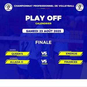 Le Hall des arts, loisirs et sports de Cotonou a vibré, ce vendredi 22 août 2025 à l’occasion des demi-finales des play-offs du championnat professionnel de volleyball. Au terme des matchs époustouflants, les affiches de la grande finale sont désormais connues : Queens # Énergie chez les dames et Allada # Finances chez les hommes.